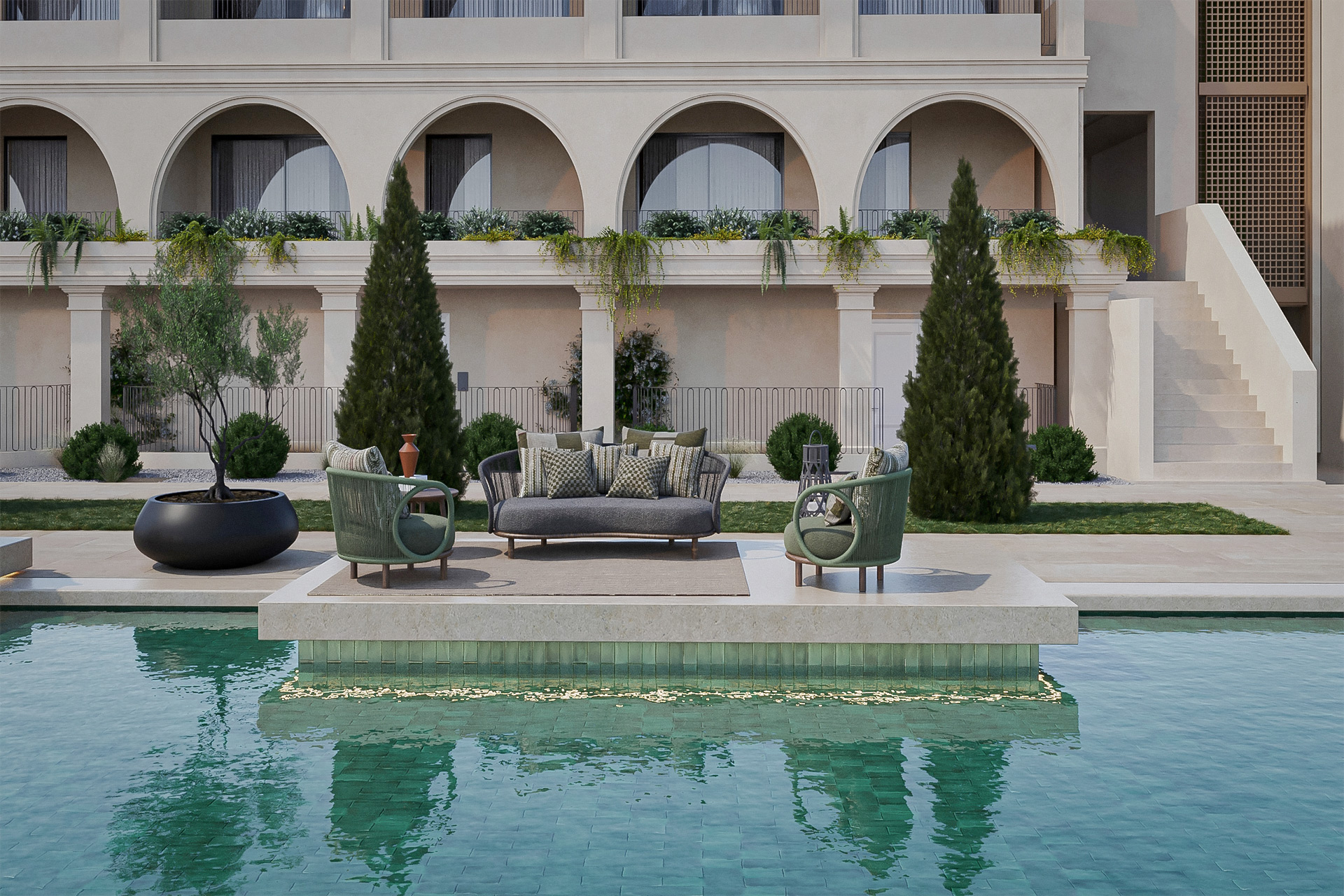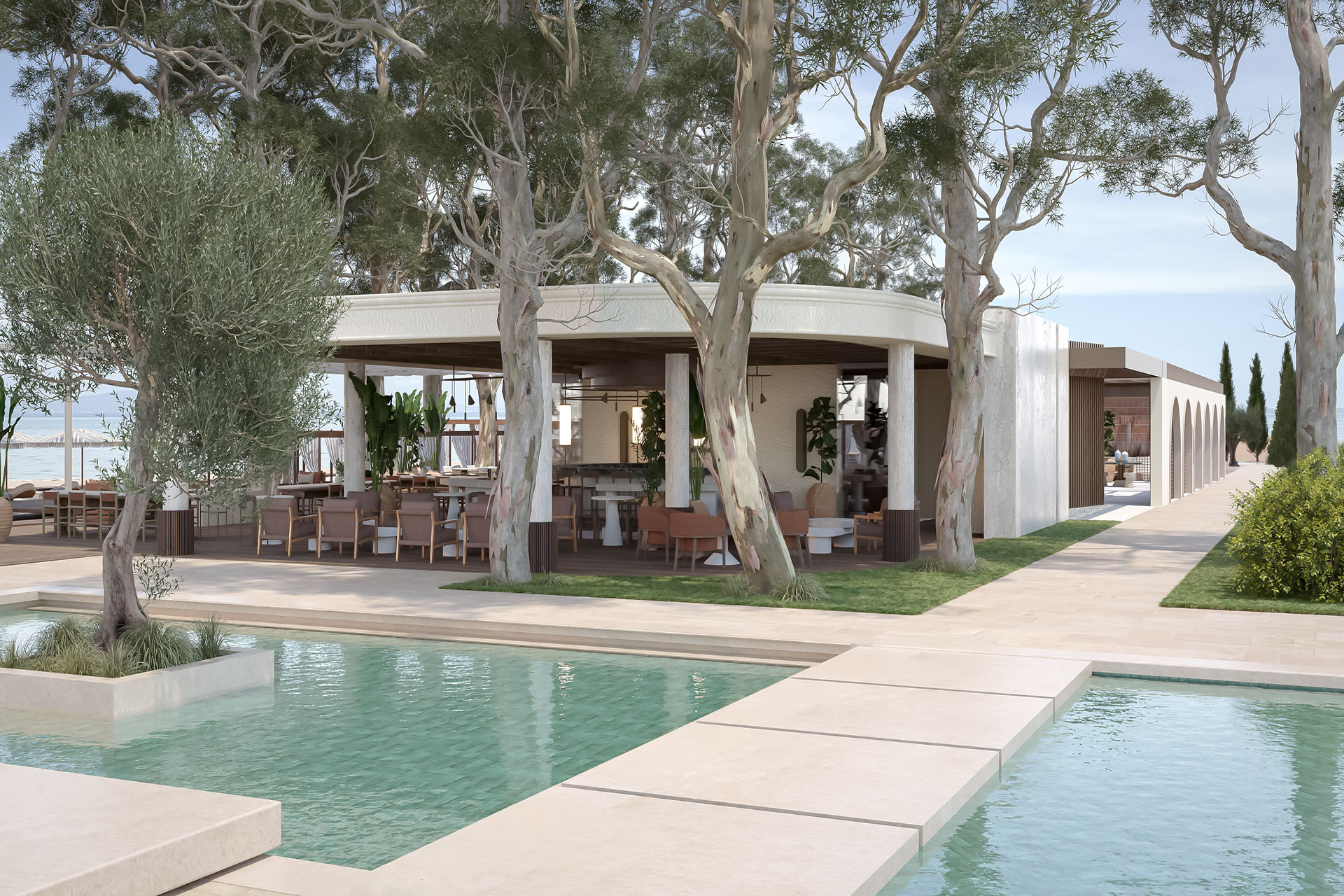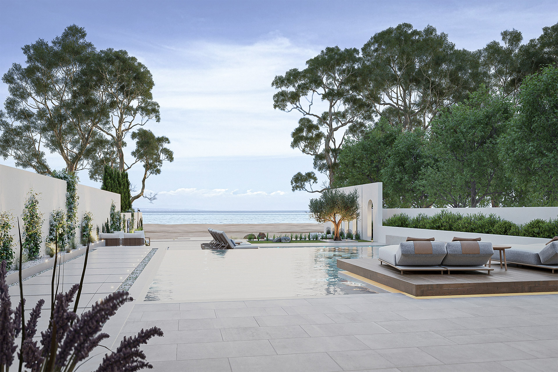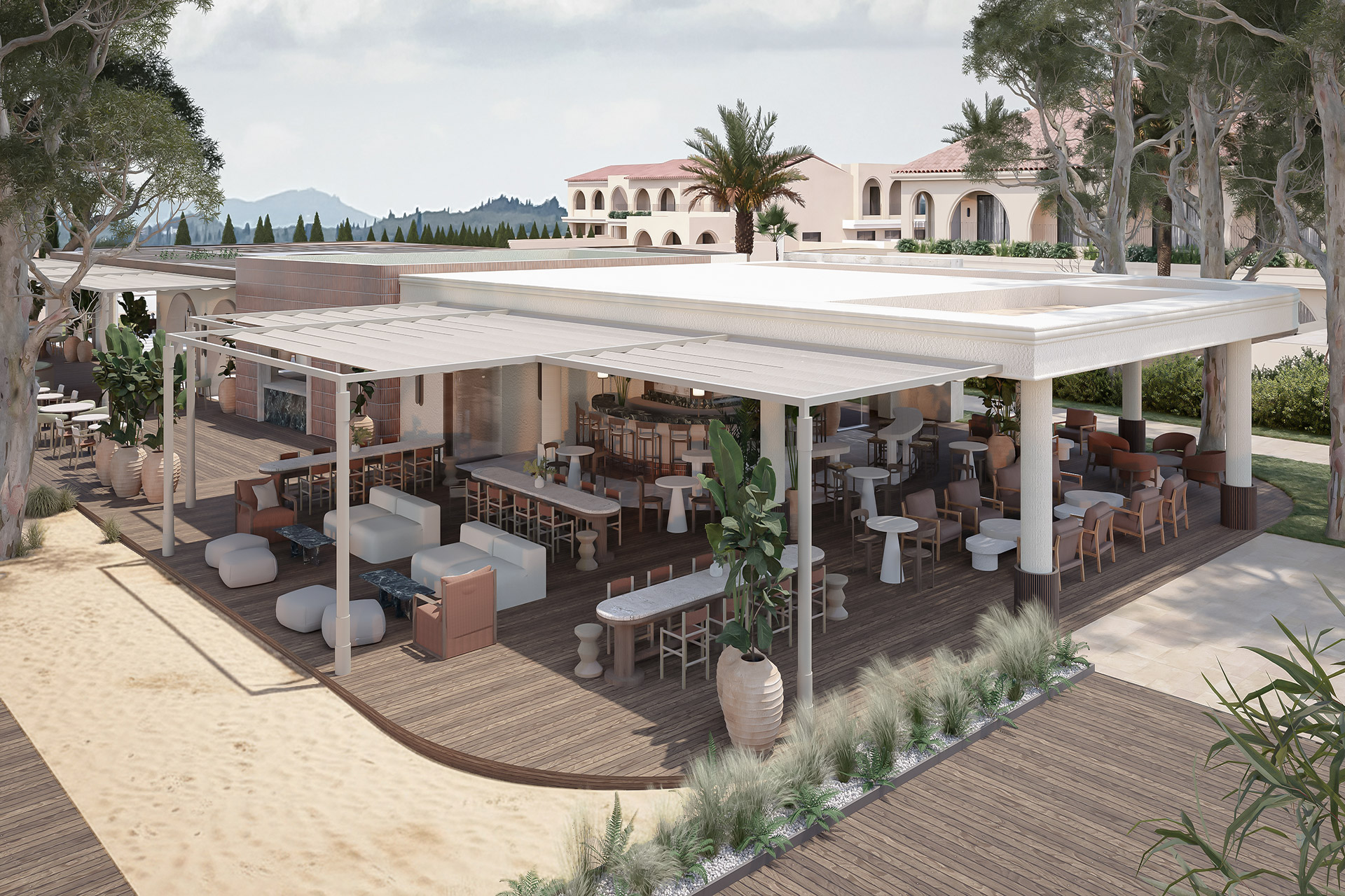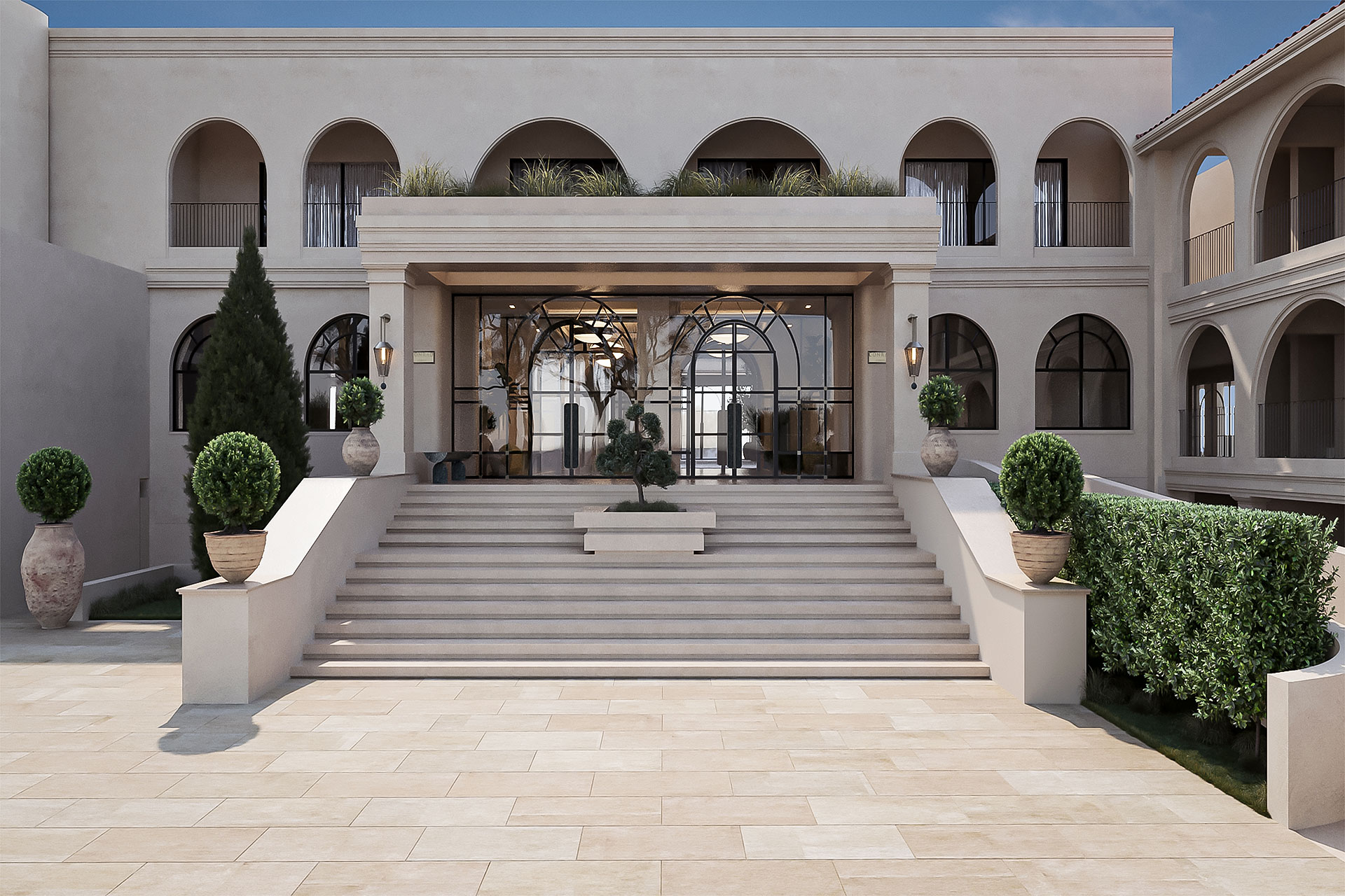 Designed and constructed by our team, the concept pays homage to Corfu’s neoclassical and Venetian heritage,reflecting the island’s timeless elegance through grand colonnades, symmetrical façades, and lush inner courtyards that echo its noble past